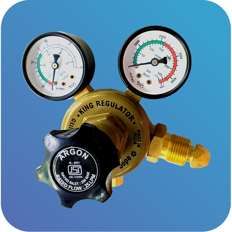 The Ador King Argon Regulator is a high-performance single-stage gas regulator engineered for TIG and MIG welding applications. Designed with an unbreakable moulded pressure knob, unique rubber diaphragm, and a precision stainless-steel valve spindle, it ensures smooth pressure reduction from 200 bar to 10 bar. This model includes an integrated outlet flow-gauge, eliminating the need for a separate flowmeter—ideal for efficient and reliable Argon gas control in fabrication workshops across Nashik. Key Features 1. Unbreakable pressure-adjusting knob 2. Unique profile rubber diaphragm for accurate pressure stability 3. Stainless-steel machined & ground valve spindle with Teflon-moulded valve 4. Dual filtration: sintered inlet filter + wire-mesh valve filter 5. Built-in outlet flow-gauge (no external flowmeter required) 6. Self-adjusting safety valve for added protection 7. Side inlet suitable for horizontal cylinder valves 8. Approx. 1.10 kg heavy-duty construction Applications 1. TIG welding 2. MIG welding 3. Fabrication workshops 4. Industrial welding operations 5. Metal processing & precision welding tasks