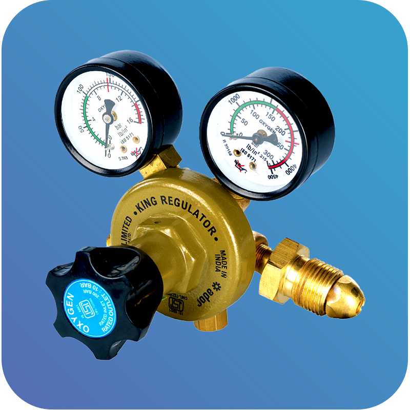 The Ador King Oxygen Regulator from the King Regulator Series is a heavy-duty, single-stage gas regulator designed to deliver stable and consistent pressure control for welding and cutting applications. Built with an unbreakable moulded pressure knob, unique rubber diaphragm, and precision stainless-steel valve spindle, it reduces cylinder pressure from 200 bar to 10 bar with excellent accuracy. Ideal for industrial, fabrication, and workshop setups in Nashik. Key Features 1. Unbreakable moulded pressure-adjusting knob 2. Unique profile rubber diaphragm for steady pressure output 3. Stainless steel machined & ground valve spindle with Teflon-moulded valve 4. Dual filtration: sintered inlet filter + wire-mesh valve filter 5. Side inlet for horizontal cylinder valves 6. Self-adjusting safety valve for added protection 7. Weight approx. 1.10 kg 8. Outlet flow-gauge design – no extra flowmeter required Applications 1. Oxygen welding & cutting 2. Fabrication workshops 3. Industrial gas handling 4. Mechanical workshops 5. Metal cutting & brazing operations